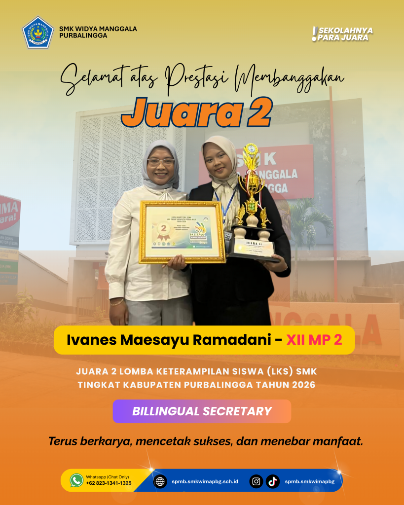 Dalam apel tersebut, Ivanes Maesayu menerima penghargaan atas prestasinya meraih Juara 2 Lomba Kompetensi Siswa (LKS) Bilingual Secretary Tingkat Kabupaten Purbalingga Tahun 2026. Prestasi ini menjadi bukti kemampuan murid dalam menguasai kompetensi keahlian sekretaris dengan standar profesional dan berbahasa bilingual.